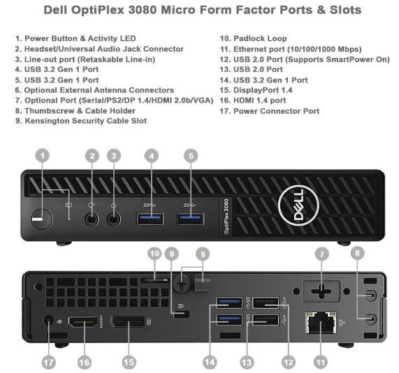 Dell Optiplex 3080 Micro, processor Intel i3-10100T CPU 3.00GHz GEN 10, RAM 8 Gb, opslagschijf 256 Gb NVMe, geen CD/DVD lezer, Windows 11 Pro geïnstalleerd. Gereconditionneerd, garantie 6 maanden.